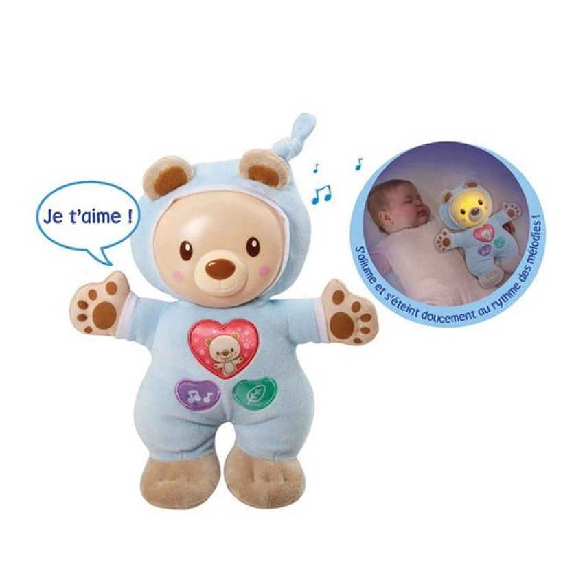 Un gros bouton en forme de cur sur son ventre pour déclencher des phrases apaisantes et des mélodies douces.