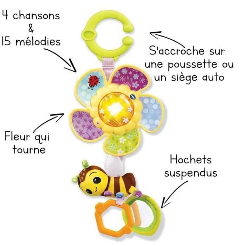 Lanneau vert permet daccrocher le jouet facilement à une poussette ou un siège auto pour amuser Bébé en balade.