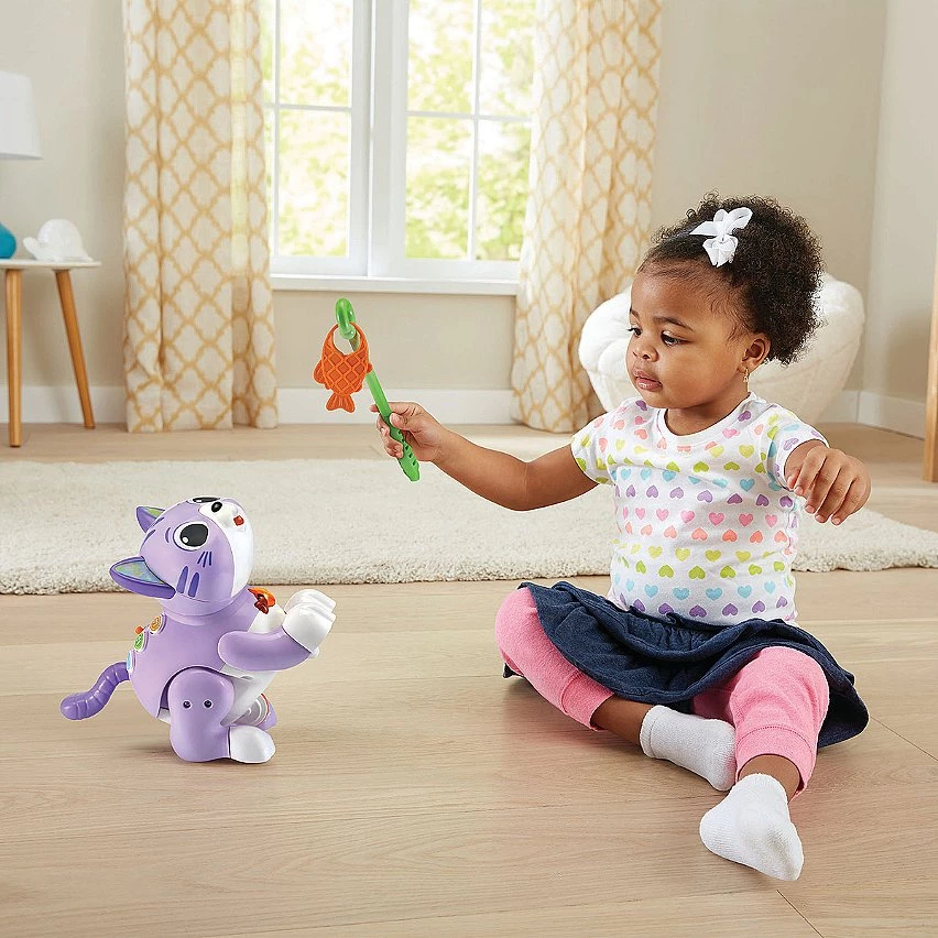 2 modes de jeu et 3 boutons interactifs sur son dos pour en apprendre plus sur les formes et les couleurs, déclencher des mélodies et faire avancer le chat !