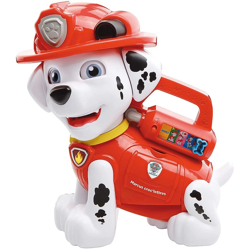 Un jeu parlant et interactif avec Marcus, le pompier de la Pat ‘Patrouille.26 os-lettres inclus à insérer dans sa bouche pour découvrir l’alphabet et un mot en rapport avec chaque lettre.4 modes de jeu : Apprentissages, Mission sauvetage, Quiz et Musique.Un bouton Badge pour déclencher des sons rigolos et des effets lumineux et un compartiment pour ranger les blocs inclus.Apprentissage des lettres, de leur prononciation et découverte de mots de vocabulaire.